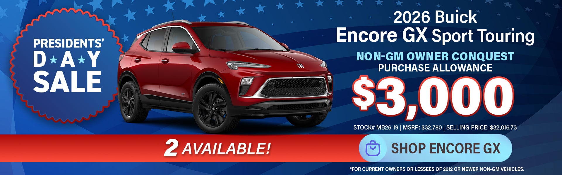 Conquest Purchase Allowance Disclaimer: General Motors is announcing a Non-GM owner conquest incentive up to $3,000 to customers who currently own or lease a 2012 or newer Non-GM (i.e. non-Buick, Cadillac, Chevrolet or GMC) passenger car or truck. Customers will be eligible to use this offer towards the purchase of select new, unused 2026 Buick Encore GX models from dealer stock. Not available with lease and some other offers. Stock# MB26-19; MSRP: $32,780; Dealer Discount: $763; No Hassle Price: $32,017. See dealer for details and qualifications. Take new retail delivery by 3/2/26.